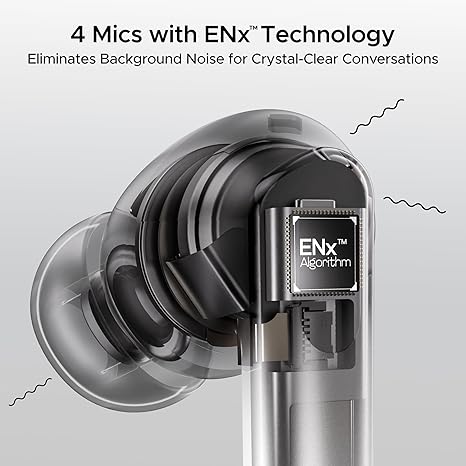 - Quad Mics with ENx Technology: Enjoy calls with high clarity indoors or on the go with the boAt Airdopes 111v2 TWS Earbuds. ENx-powered quad mics cancel background noise so you won’t have to search for a quiet spot.